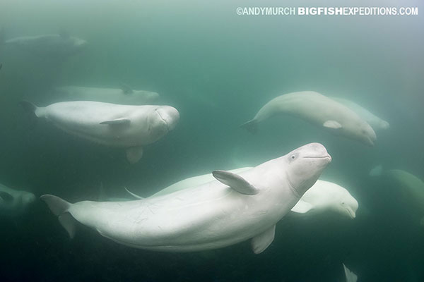 When we first arrived in Churchill the forecast wasn’t that great. Strong winds and rain further south in Manitoba had reduced visibility in the river mouth to just a few inches. That is the area with the thickest belugas so I expected a challenging week ahead but fortunately with 3500 belugas in this part of Hudson Bay, it was always possible to find pockets of clear water that contained belugas.