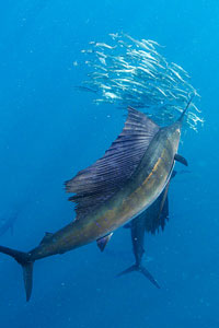 It was not easy to keep up with the sailfish as they pursued the panicked sardines. The photography was extremely challenging too because (perhaps in an effort to give their pursuers the slip) the sardines always seemed to swim into the sun.