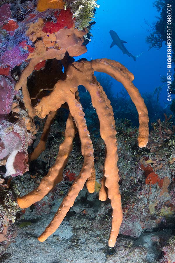As we weren’t feeding the sharks, they were a little more standoffish than at other sites on the trip but this gave me a chance to get creative with the corals and sponges with sharks in the background.