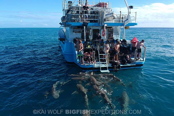 The following morning delivered favorable diving conditions and we moved to Fish Tales, the ‘go-to-spot’ for reliable encounters with tiger sharks. Surprisingly, none of the guests had ever successfully dived with tiger sharks, and the crew were feeling the pressure to deliver a positive experience. Thankfully, the first feed of the day ticked the ‘bucket-list’ tiger shark box. Our luck continued throughout the day and the week, as we shared the ocean with as many as 8 tiger sharks on many of our dives.