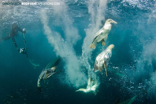 When we approached, the sky was filled with gannets raining down on one boiling patch of ocean. We tumbled in immediately. Looking down through clear blue water, all I could see were sharks! A pack of bronze whalers smashed through the bait ball while gannets continued to drop out of the sky all around them. It was a sight to behold.