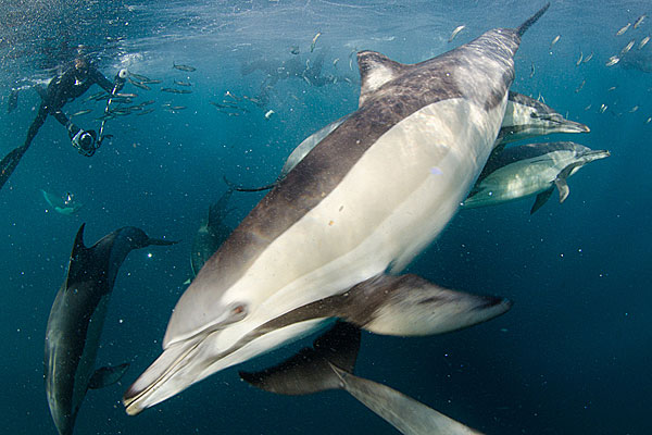 After a few minutes the sharks were replaced by about a dozen lightening fast common dolphins that bored holes through the ranks of the hapless bait fish, picking off one sardine after another and leaving thousands of glittering scales drifting into the inky depths.