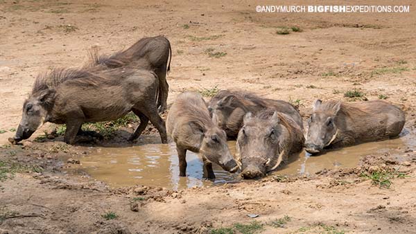Common Warthogs taking a bath in the midday sun. They do this to keep cool and to deter parasites.