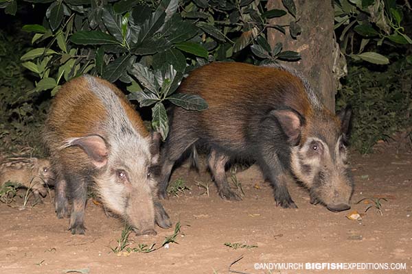 In the evening we had a short encounter at the lodge with a family of bush pigs. Unlike the warthogs, these are nocturnal forest dwellers and very shy around humans.