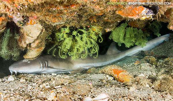 After our thresher dives each morning we would return to shore for breakfast and then go in search of smaller sharks and a myriad of other critters that inhabit Malapascua’s colorful reefs. It wasn’t an easy task because catsharks and bamboo sharks hide in deep recesses during the day, waiting for the cover of darkness. So I’m really happy to report that after a lot of searching we found two coral catsharks and a large banded bamboo shark to film.