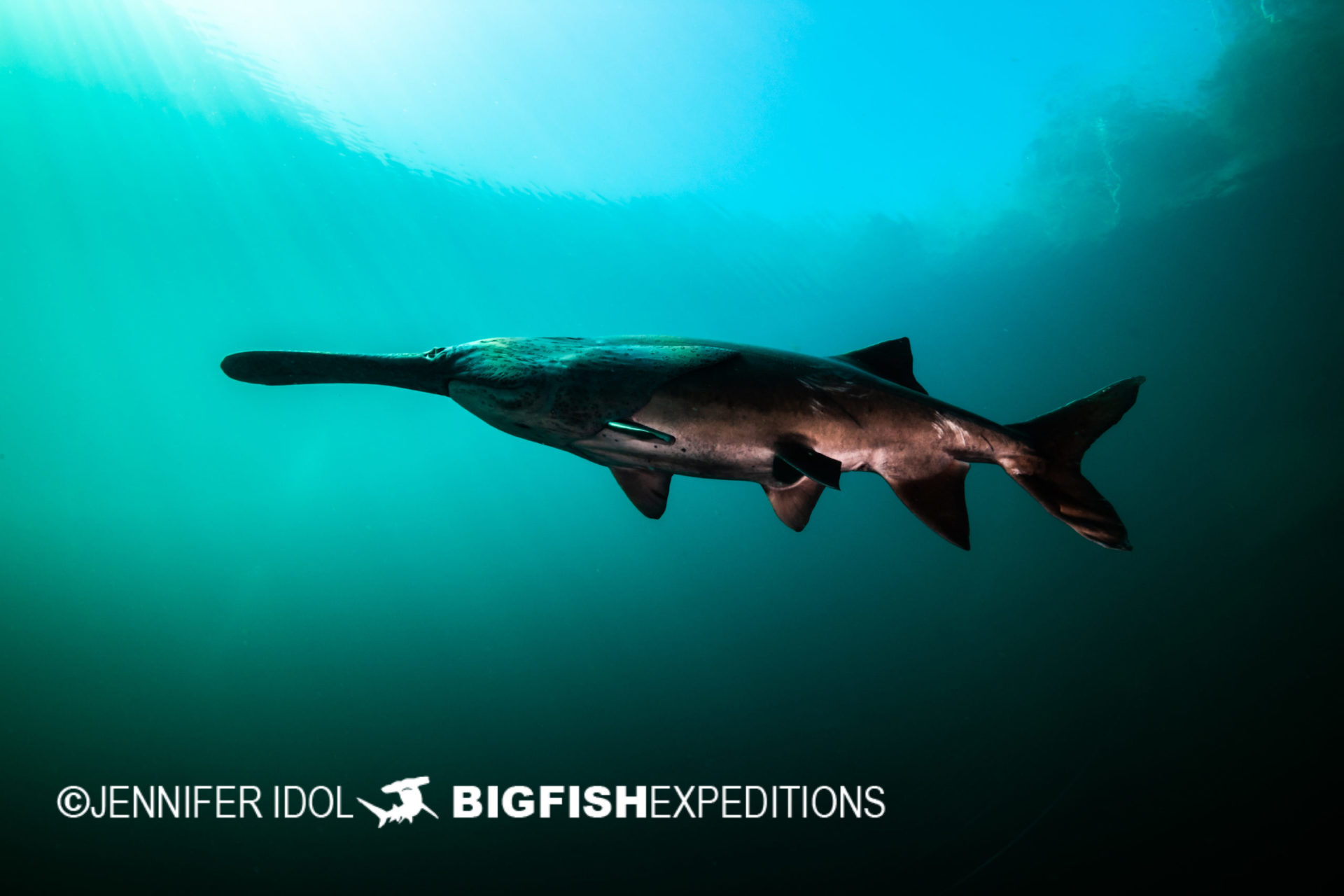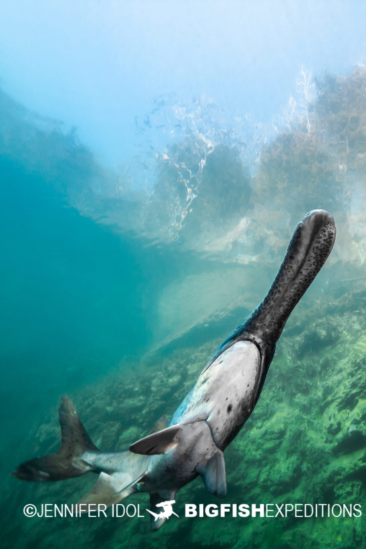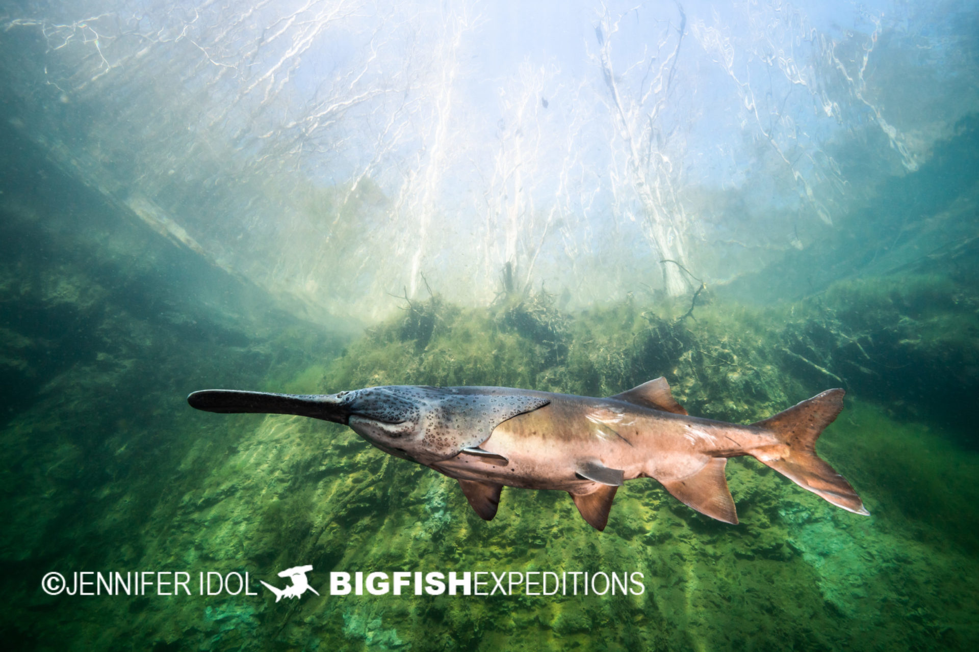 We added a day to this year’s itinerary to allow more time with the paddlefish. They tire of people’s presence, so we limit dives to two a day to give the best encounters and to allow everyone time to warm up. However, no one in the group tired of seeing paddlefish. Everyone saw paddlefish on every dive. As always, photographic opportunities were challenging; the paddlefish swam vigorously, while I focused on creative compositions.