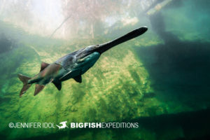 We also focused on the best approaches to the fish to avoid startling them as best as possible. When a paddlefish is relaxed, it will swim leisurely; much like sharks. Also like sharks, an irritated or startled paddlefish will increase speed and disappear at will. They do not seem to ever stop moving, though they may swim very slowly at almost a hover.