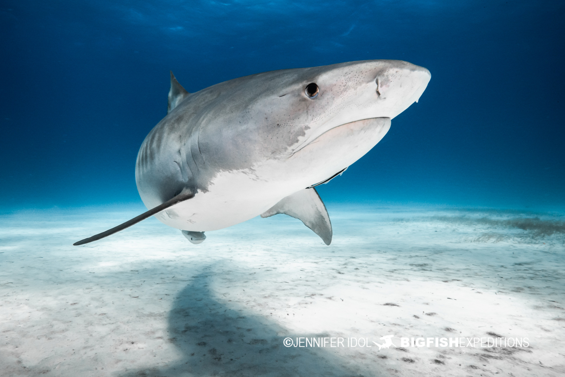 It takes a sunny day to cast a shadow onto the sand from tiger sharks. On the first and last day of our trip, we had ideal weather to bring out the sunny Bahamian waters traditionally seen in photography from Tiger Beach. It was exciting to see the tiger sharks coming across the reef from a distance.