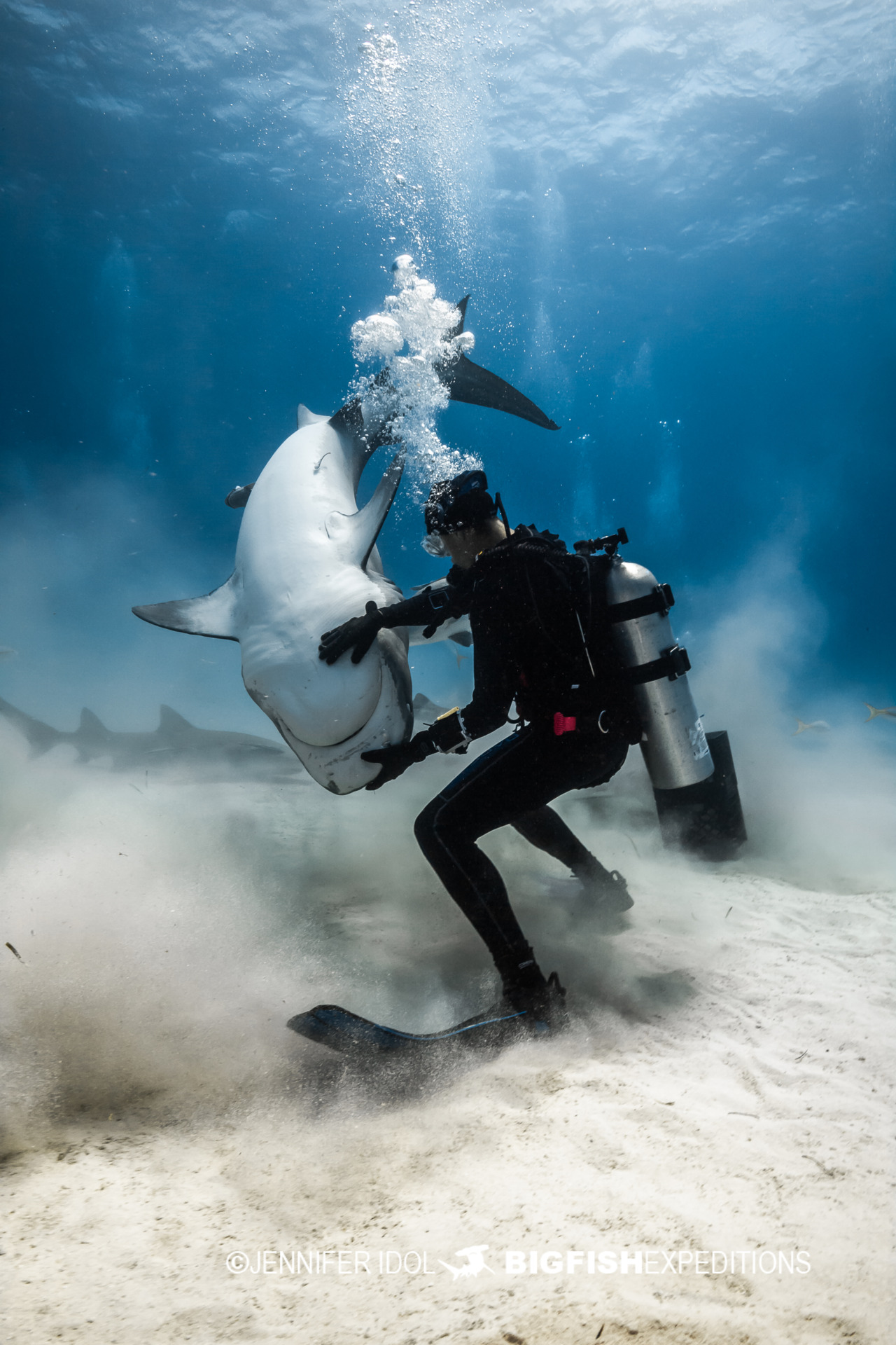 Trained handlers feed the sharks to keep them in the shallow area of Tiger Beach. When they are not being fed, the tiger sharks go over the ledge to deeper waters to hunt at night. The feeds are necessary to keep the sharks in the area, but they use targeted fish as bait and do not chum excessively. When we’re not engaged in a feed, we are able to dive freely around the reef and see free swimming sharks.