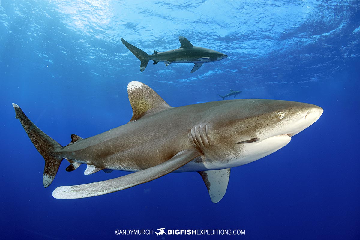 Oceanic Whitetip Sharks make perfect photo subjects because they’re bold enough to get really close to the camera for great shark portraits, but docile enough to dive with, unless there is too much chum in the water. We are extremely careful about how much stimulant we use in order to keep the sharks interested but not agitated.