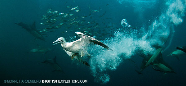 Scuba diving and snorkeling around giant bait balls with sharks, dolphins and whales. Plus shark diving on South Africa’s ‘Wild Coast’