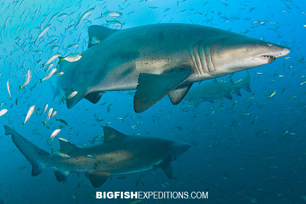 If the visibility is suitable inshore, we will also reef dive to see ragged tooth sharks aka sandtiger sharks. There are one or two reefs close to Port Saint John where these ferocious looking sharks sometimes gather in great numbers.