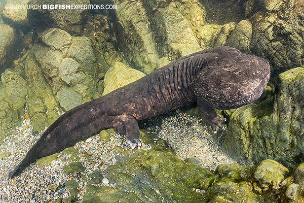 Ducking your head underwater you scan the area for overhangs that may harbor your quarry. Peering into the shadows, you see nothing but small fishes and flattened river rocks piled together. Disappointment starts to rise but then one of the rocks moves slightly and it dawns on you that the flattened rock you have been ignoring is the dinner plate sized head of a giant salamander!
